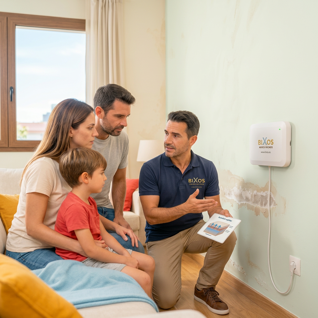 Frente a esa lógica reactiva, Bixos plantea algo diferente: un sistema técnico que actúa de forma continua sobre la humedad por capilaridad — el factor que más favorece la presencia de insectos — sin químicos, sin fumigaciones, sin mantenimiento. Conectado a la red eléctrica, funciona las 24 horas sin interferir en la vida diaria del espacio. Cuando se controla la humedad, los insectos desaparecen. No hay solución más eficaz que quitarles el hábitat.